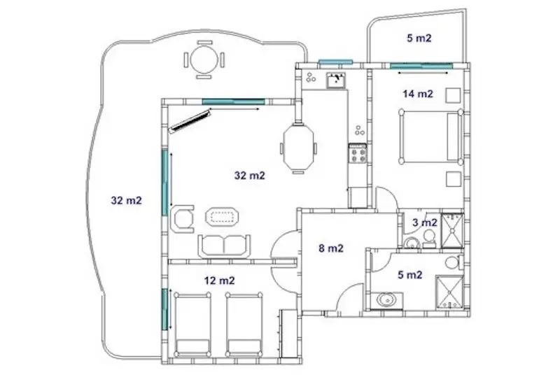 Diese wunderschön eingerichtete, 125 m² große Immobilie bietet einen idealen Rückzugsort mit heimeliger und entspannter Atmosphäre. Der großzügige, offene Wohnraum ist hell und luftig, mit bodentiefen Fenstern und einem großen Balkon mit herrlichem Blick auf Pool und Garten. Rechts vom Raum befindet sich eine moderne Küche mit Essbereich und Terrassentüren – ideal für Mahlzeiten im Freien. Der geräumige Flur bietet Zugang zu allen Räumen, einschließlich eines Gästebadezimmers. Es gibt außerdem zwei Doppelschlafzimmer, von denen das größere über einen Balkon und ein eigenes Bad verfügt.
